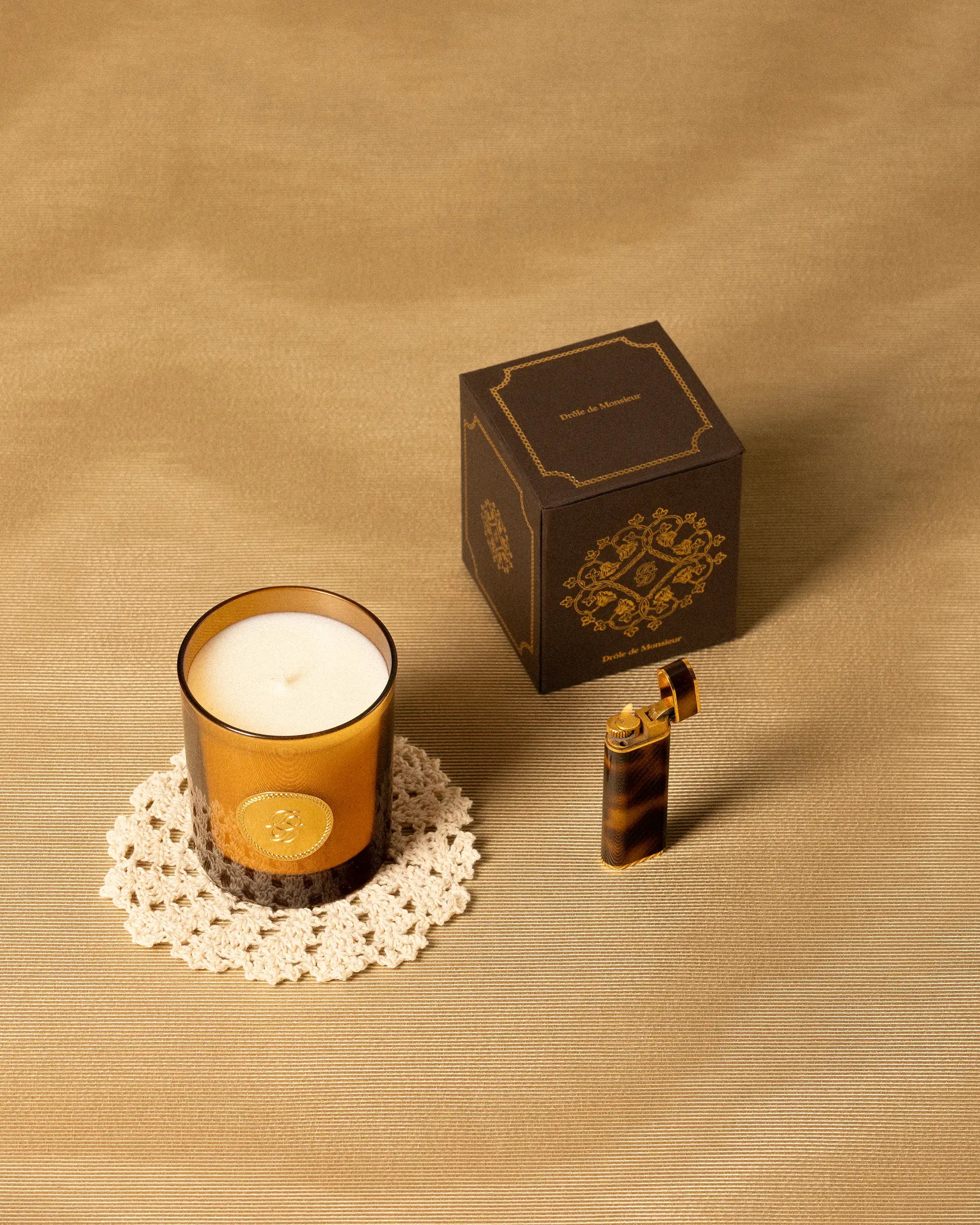Inspired by the unique atmosphere of the Drôle de Monsieur Flagship, this candle recreates the intimate calm of a lounge where aged leather meets the enveloping swirls of precious woods. The first fresh and spicy notes of lemon, elemi, and clove gradually give way to a refined heart of leather, softened by rose and violet, and elevated by the depth of oudh.