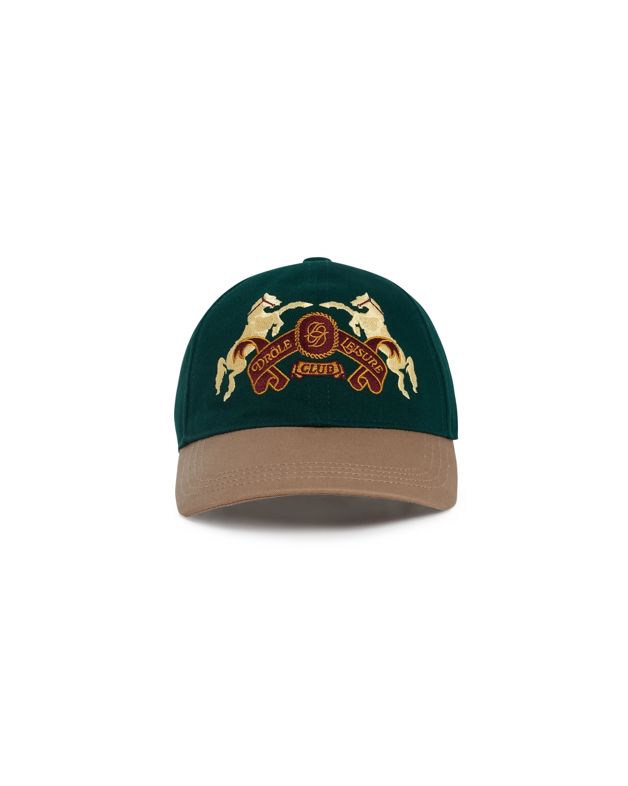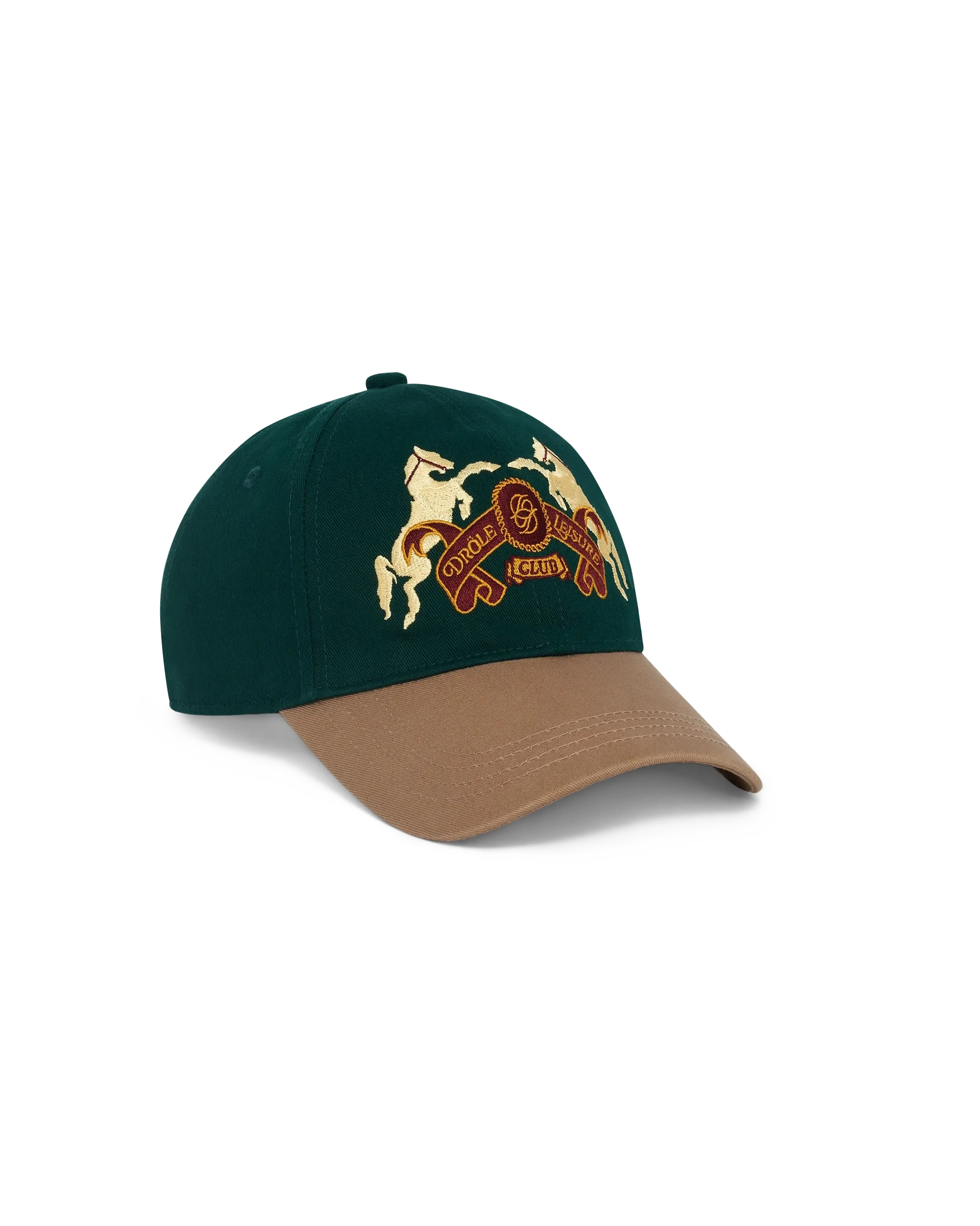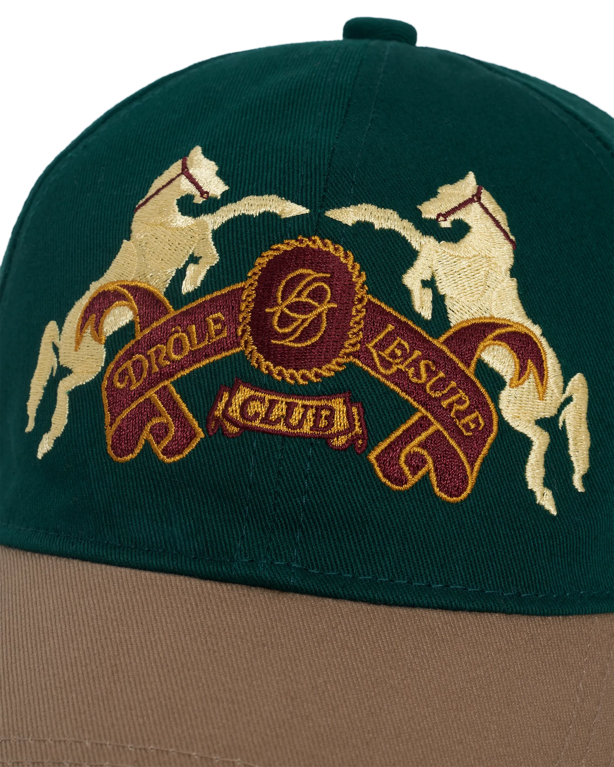 This dark green 100% cotton 6-panel baseball hat has a contrasting visor, an adjustable strap and an engraved 'Drôle' metal buckle. It features the Emblème Chevaux embroidery on the front.