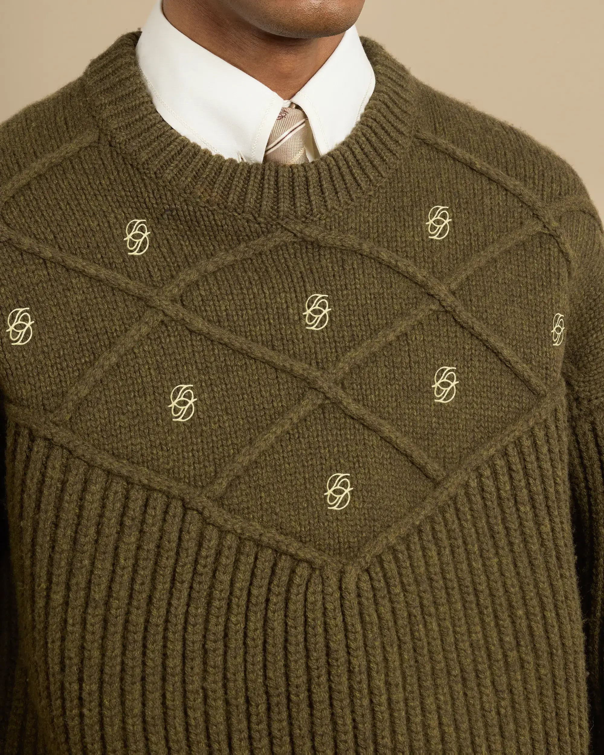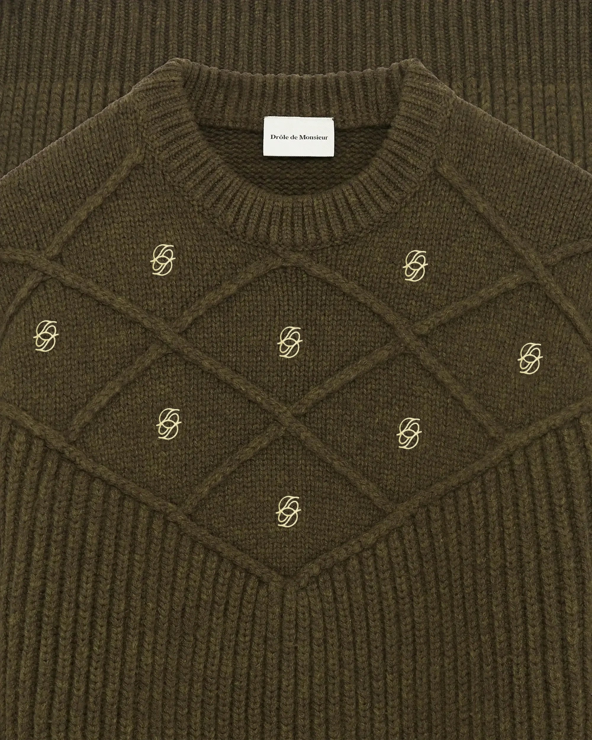 This kaki 100% wool ribbed knit sweater features contrasting 'D' mirror embroideries on the chest. A mix of diamond knit and chunky knit,