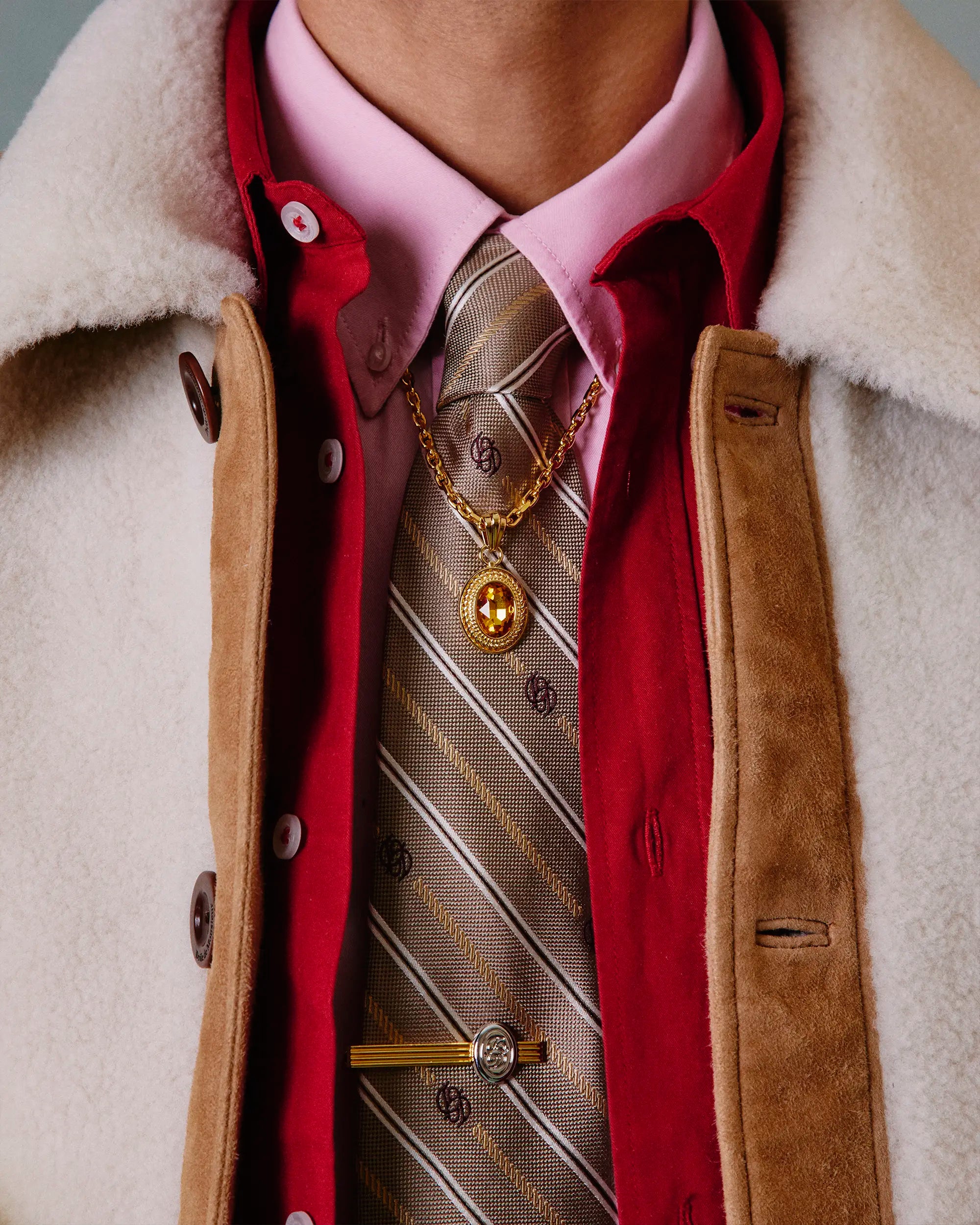 This golden textured tie clip is made from brass and zinc alloy. It features a silver medallion with an engraved 'D' mirror logo.