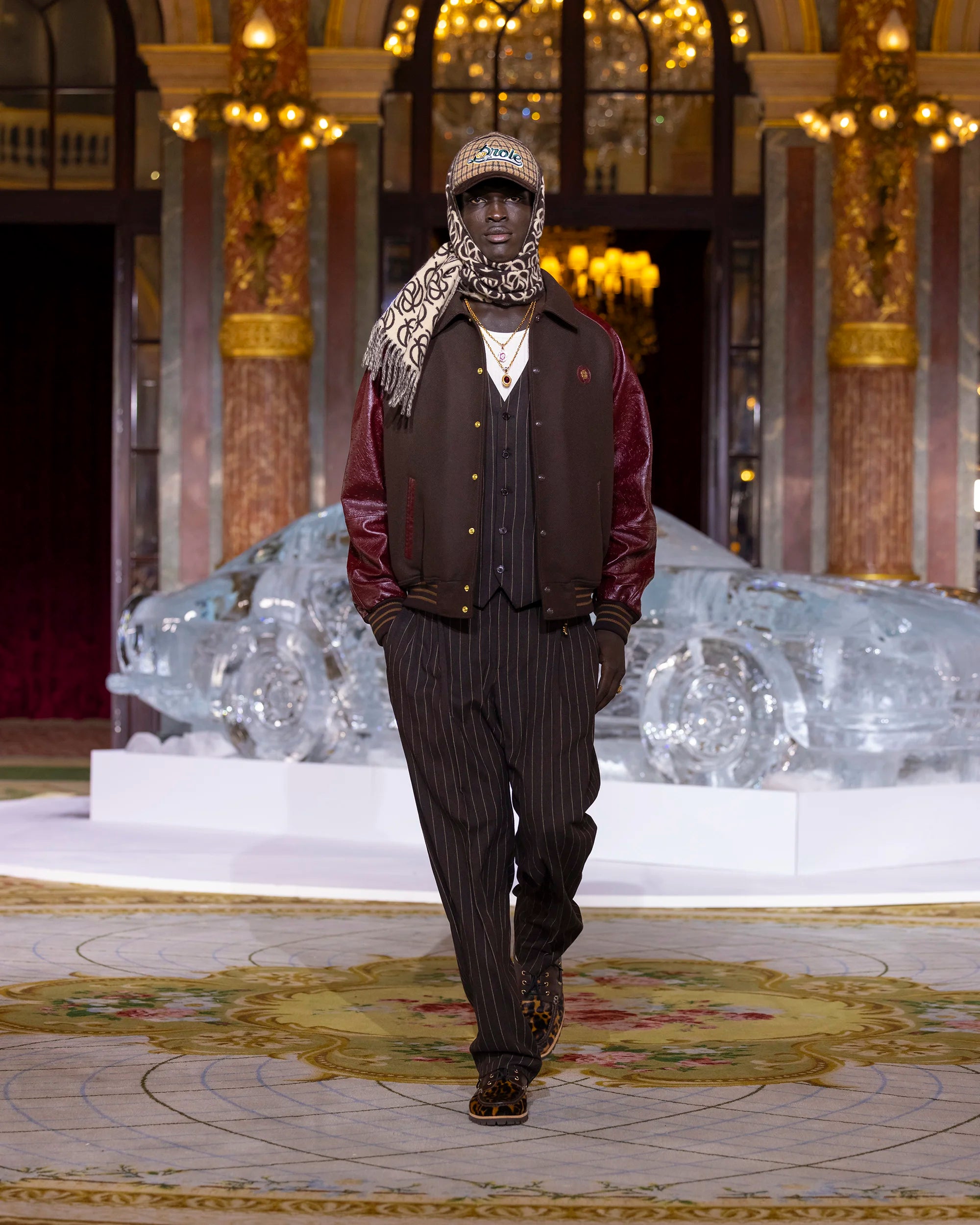 This dark brown varsity jacket is made from sheepskin leather and a wool blend. It has a shirt collar, a 'D' mirror leather patch on the chest, seven 'D' mirror lacquered snap buttons, leather raglan sleeves, two raglan pockets with leather piping, and bicolor ribbed trims.