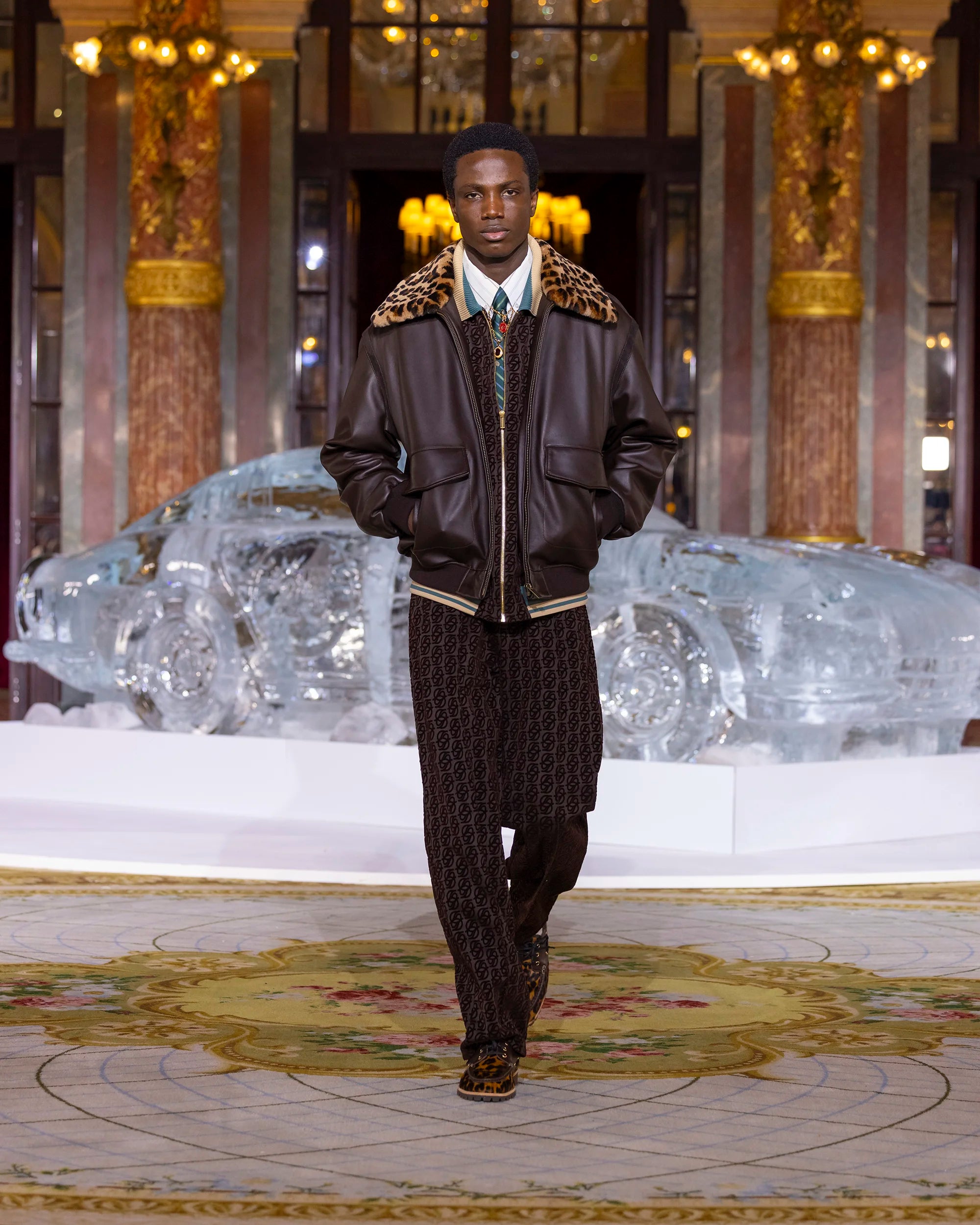 This dark brown aviator jacket, made from 100% leather, features a removable leopard-print shearling lambskin collar, two flap pockets with hidden snaps and side openings, ribbed hem and cuffs, and suede panels at the armholes and shoulders.