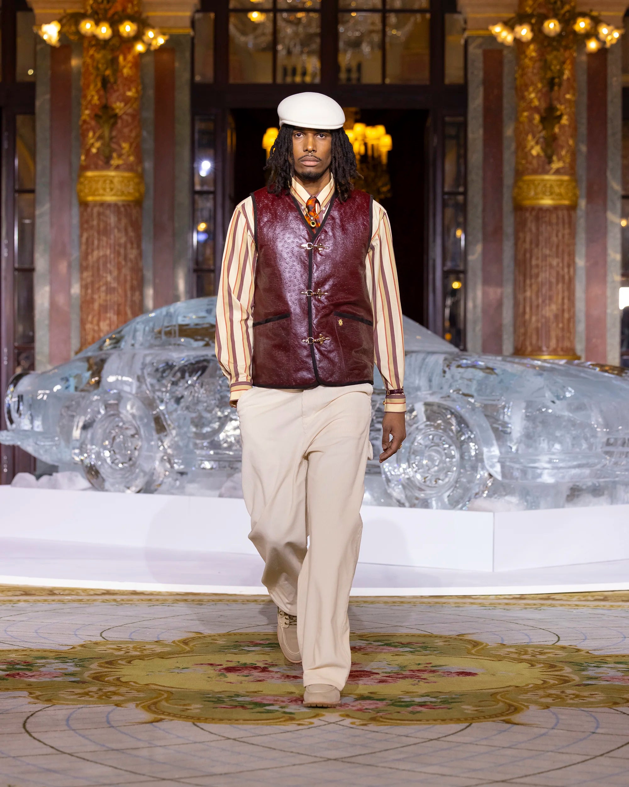 This sleeveless burgundy jacket, made from 100% leather, has polyester padding and a viscose lining. Featuring a loose fit and V-neck collar, it includes three firefighter-style clasps, contrasting suede trims and two patch pockets.