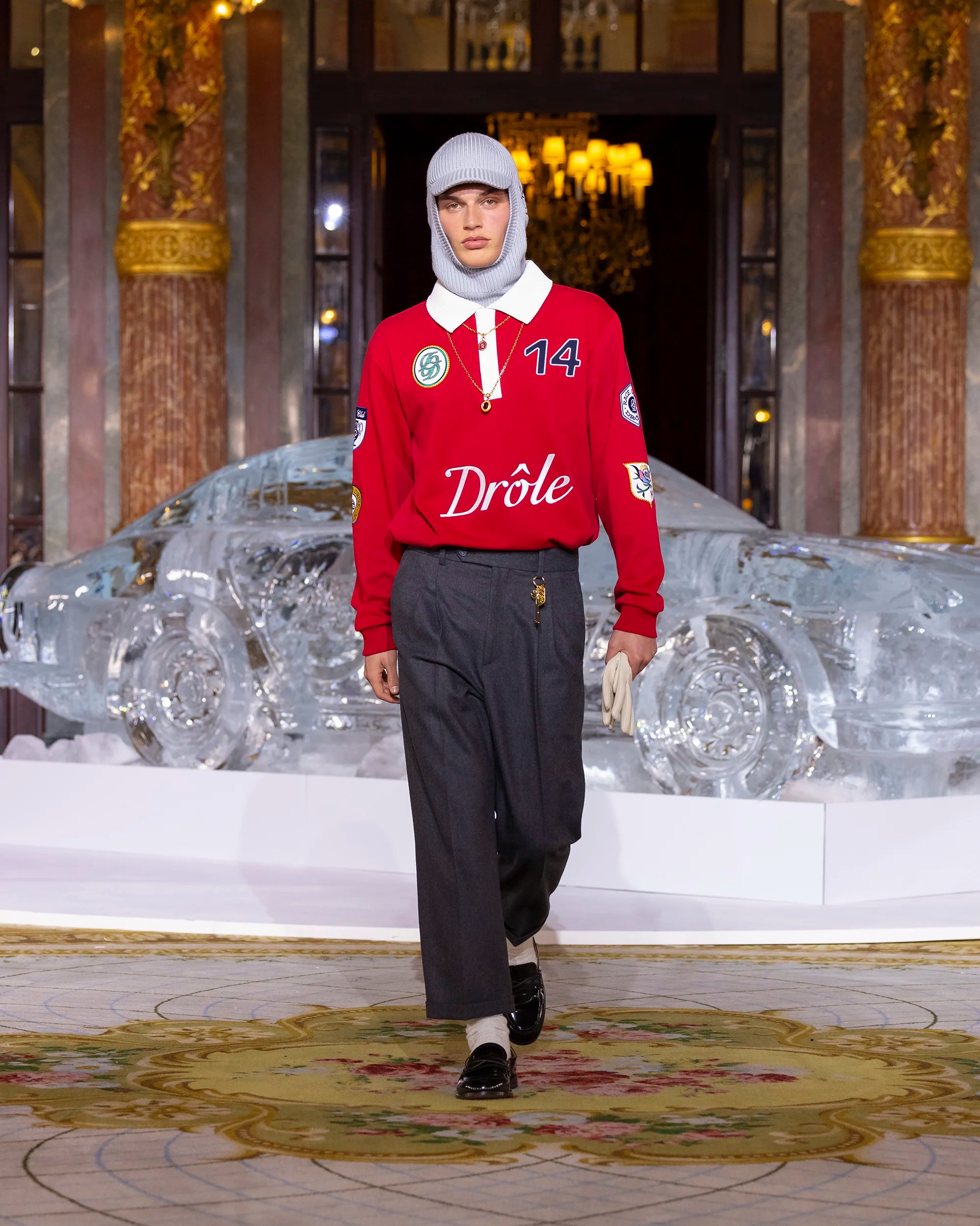 This red 100% cotton long-sleeved polo is decorated with patches and a 'Drôle' embroidery on the front and back. It has a contrasting ribbed collar and button placket as well as ribbed cuffs.