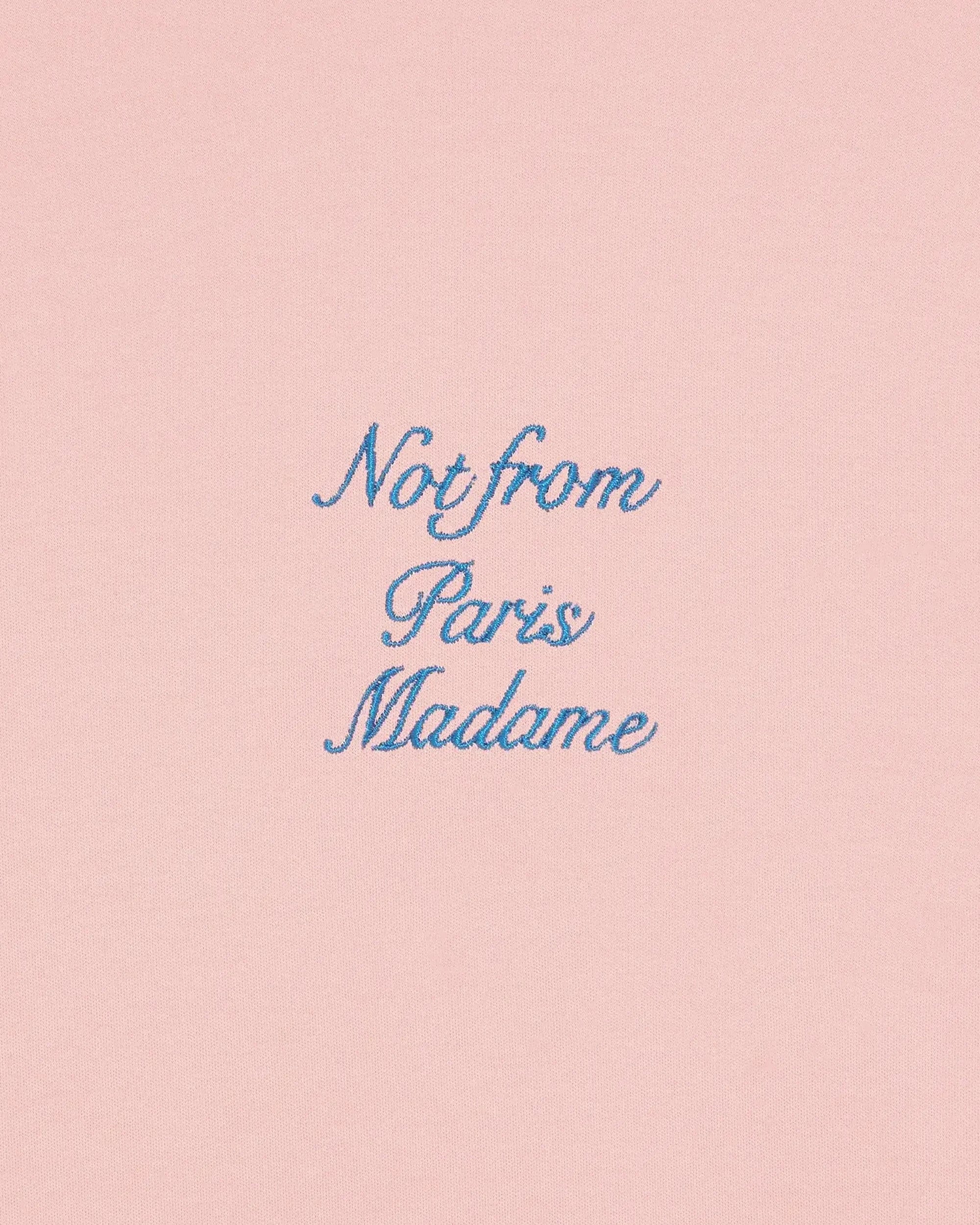This light pink 100% cotton interlock t-shirt with a ribbed neckline features the 'Not from Paris Madame' slogan embroidered calligraphy-style on the front and back.