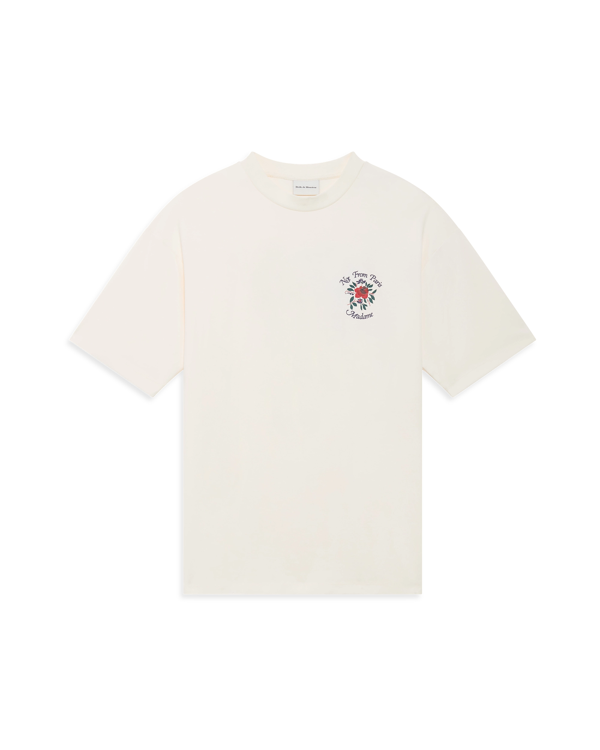 This cream 100% cotton interlock t-shirt with a ribbed neckline features the 'Slogan Fleurs' print on the front and back.