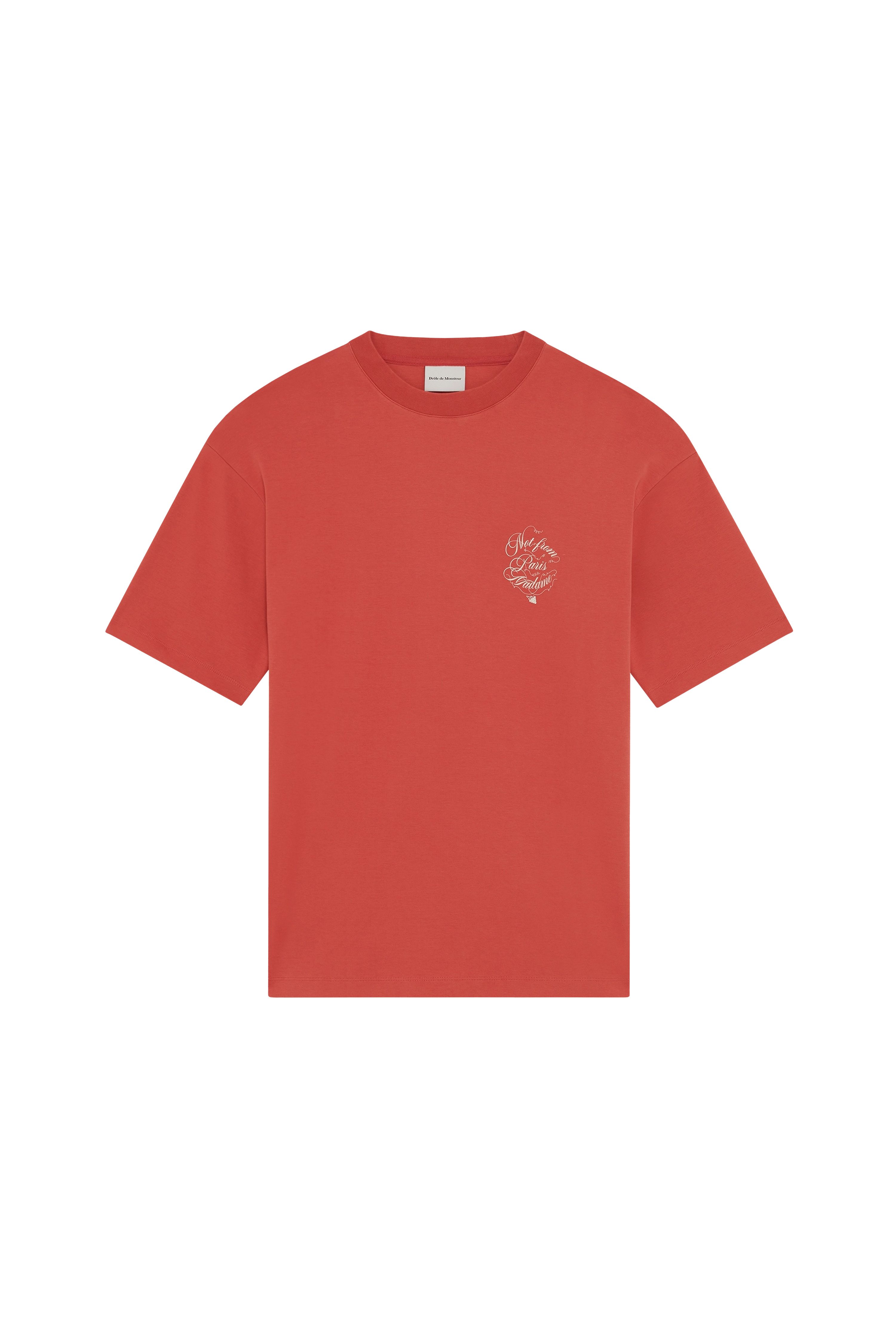 This red 100% cotton interlock t-shirt with a ribbed neckline features the Slogan Vignes print on the front and back.